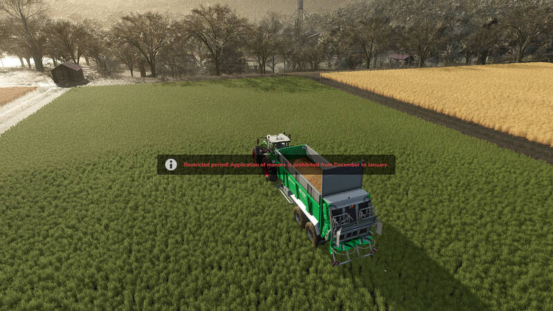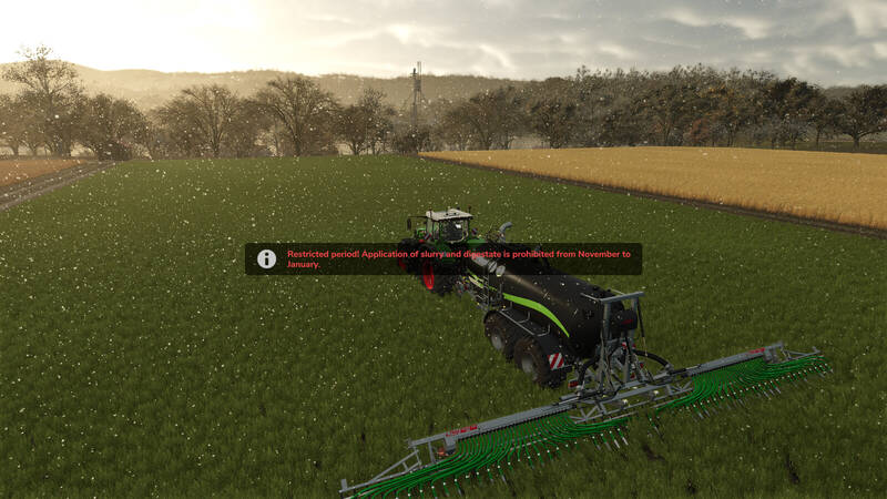 If a player attempts to use a slurry tanker or manure spreader during these restricted periods, the action is blocked, and a warning message such as "Restricted Period!" or "Ground Frost!" is displayed.