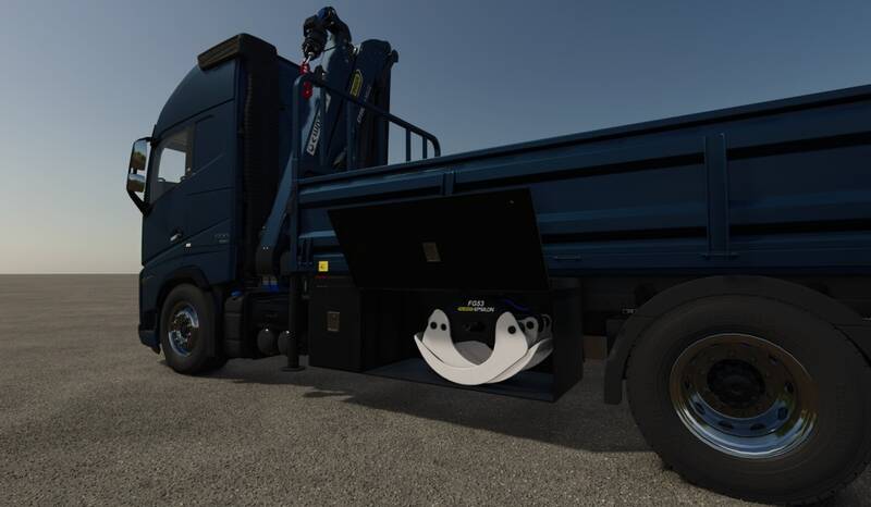The crane requires separate purchase of interchangeable modules from the store: a log grapple and a hook for loading pallets and big bags. Modules can be stored in the truck's side boxes (U - select box, Y - open/close box).
